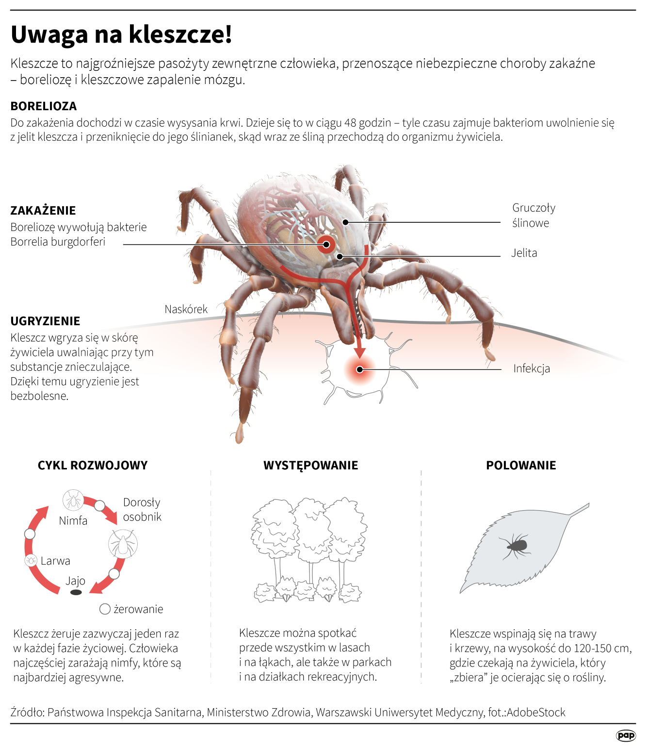 „Przede wszystkim pamiętajmy, że nie jest tak, że w momencie ugryzienia on od razu przekaże nam groźne bakterie. Tylko pewien odsetek kleszczy jest ich nosicielami. Poza tym ważny jest czas - w przypadku krętków boreliozy minimalny okres żerowania niezbędny do zakażenia człowieka wynosi 24 godziny. Jeśli więc usuniemy kleszcza ze swojego ciała w przeciągu doby, to w zasadzie nie ma ryzyka zachorowania” - powiedziała Dagmara Wężyk.
