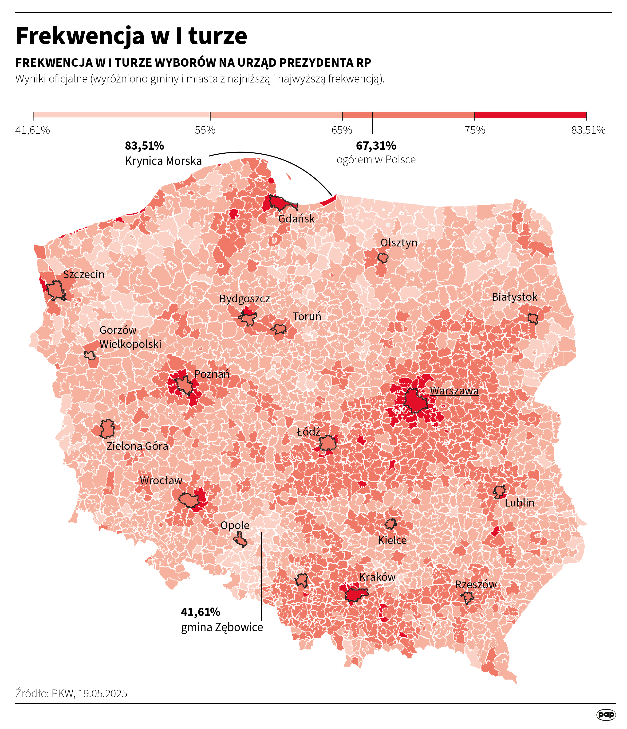 Karol Nawrocki najwyższe poparcie uzyskał w gm. Chrzanów w województwie lubelskim - 64,95 proc. głosów, gm. Przytuły w woj. podlaskim - 64,49 proc. i w gm. Godziszów (ponownie Lubelskie) - 64,15 proc.. Najsłabsze poparcie miał w Wiśle w woj. śląskim - 12,13 proc., w gminie Komorniki w woj. wielkopolskim - 12,23 proc. i w dzielnicy Wilanów - 12,26 proc.