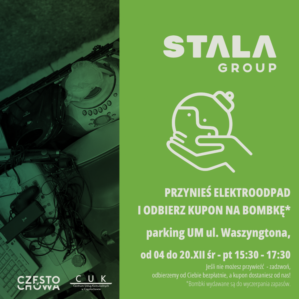 Centrum Usług Komunalnych w Częstochowie we współpracy ze STALA Group, w ramach corocznej akcji zbiórki elektroodpadów, będzie rozdawać darmowe choinki – łącznie 300 ciętych świerków. Po świąteczne drzewko można przyjść 15 grudnia od godziny 15:00 na Plac Biegańskiego.