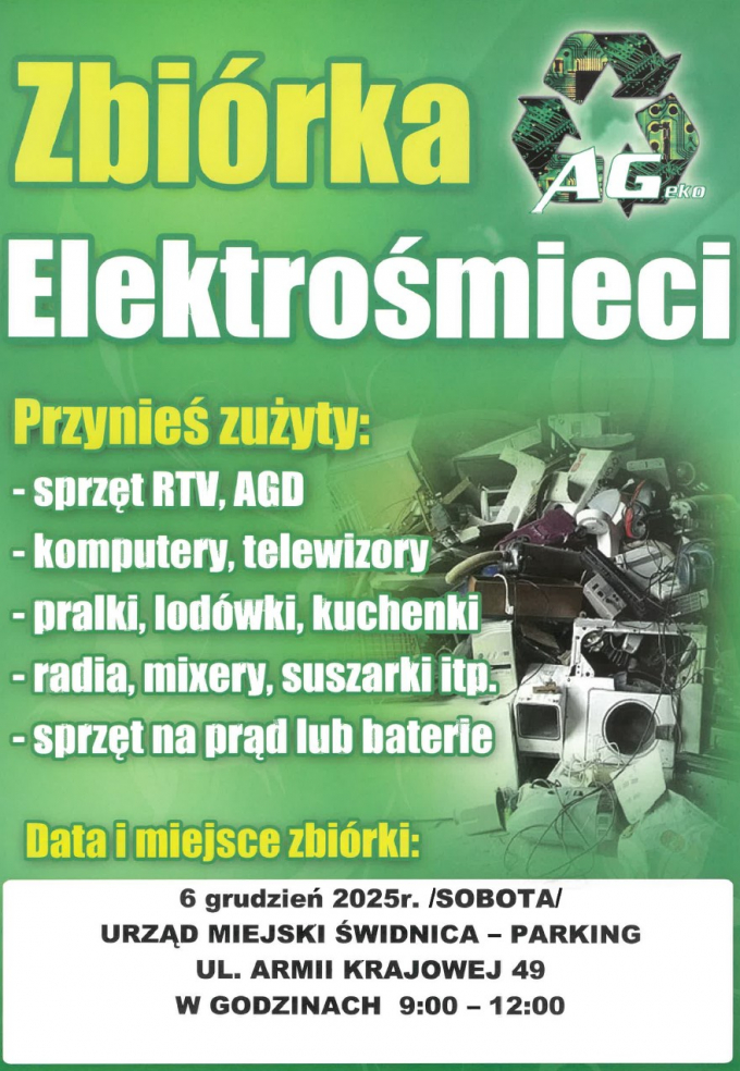 Jesteś w trakcie przedświątecznych porządków? Nie wiesz co zrobić z odpadami elektrycznymi i elektronicznymi? Przyjedź w sobotę, 6 grudnia w godzinach od 09:00 do 12:00 na parking Urzędu Miejskiego w Świdnicy i pozbądź się odpadów nieodpłatnie. Miasto wspólnie z firmą AG-EKO organizuje kolejną zbiórkę elektrośmieci.